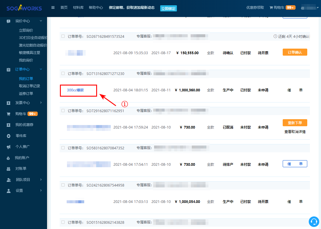 4. 點(diǎn)擊【零件名稱】,進(jìn)入訂單詳情頁面